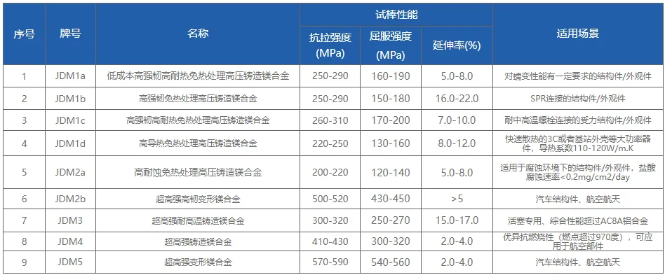 JDM1b是专为车身结构件开发的高强塑性镁合金,JDM1c是为电机壳体等设计的耐热压铸合金,同时兼具优异的耐蚀性能。